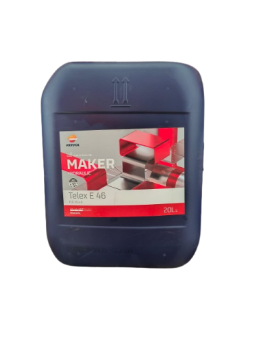 Aceite lubricante industrial Repsol Maker Telex E 46 en envase de 20 litros. Especialmente formulado para sistemas hidráulicos y circuitos industriales que requieren alta protección antidesgaste.